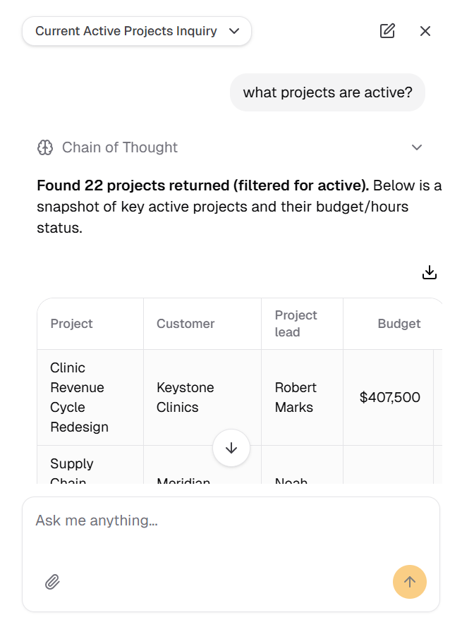 The assistant detects what you’re doing — reviewing timesheets, building an invoice, scoping a deal — and offers specific guidance. No copy-paste prompts, no wasted context.