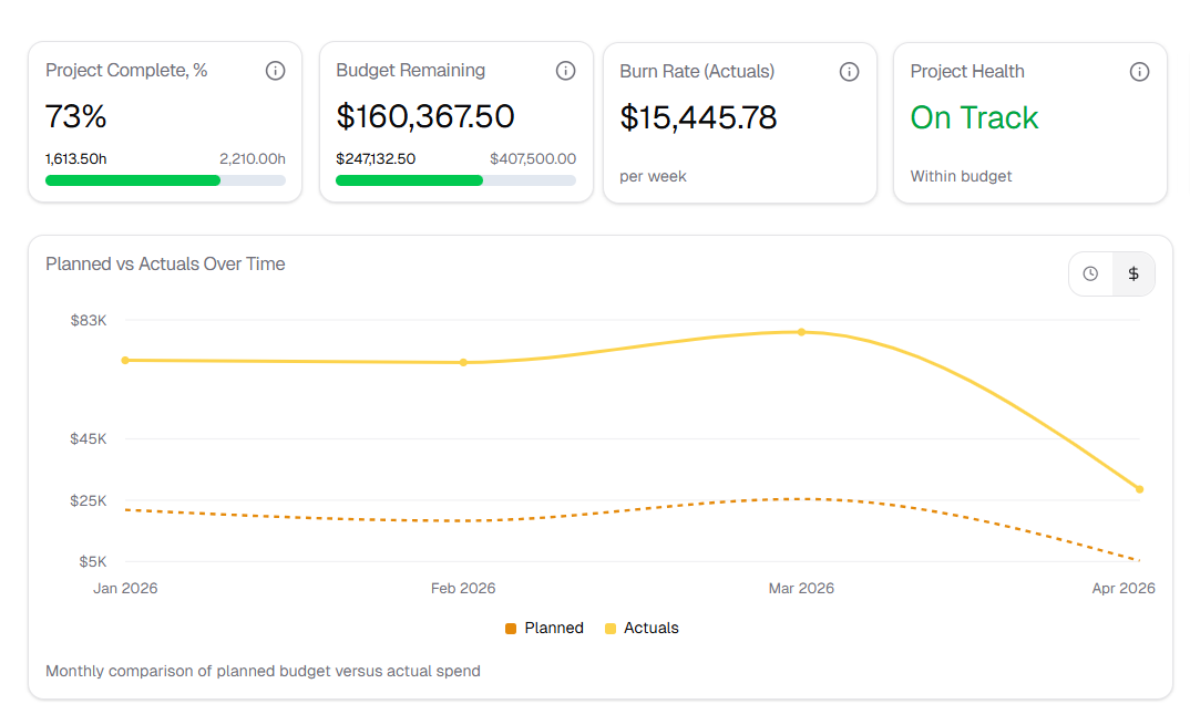 Utilization trends, revenue leakage, margin risk, stale approvals — surfaced on dashboards with clear next steps. Less time reading charts, more time taking action.