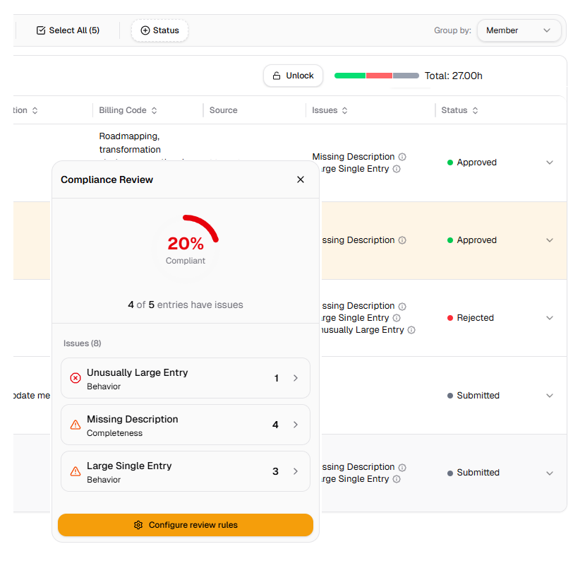 Delivery leads and reviewers see exactly what changed and why. Every status — open, in review, approved, rejected — is timestamped and audit-ready, so billing happens on clean, trusted data.