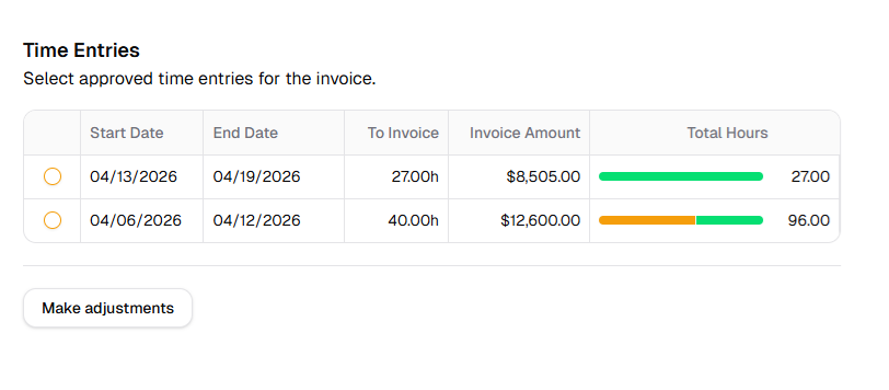 Once hours are approved, they're available to pull into invoices with the right rate and project context already attached. No spreadsheet shuffling, no lost hours, no last-minute reconciliation.