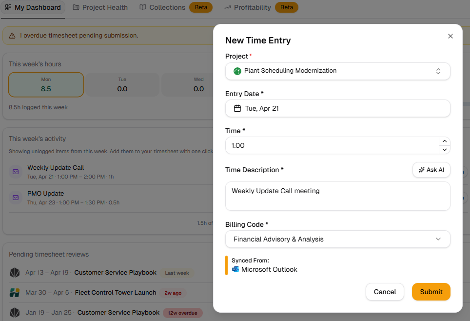 The PSA operating system for consulting firms. Real-time visibility into time, utilization, project health, and billing — in one place.